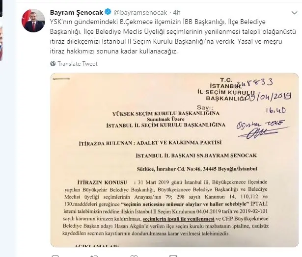 AK Parti İstanbul İl Başkanı Bayram Şenocak, Büyükçekmecedeki seçimlerin yenilenmesi talepli olağanüstü itiraz dilekçesini İstanbul İl Seçim Kurulua verdiklerini açıkladı.