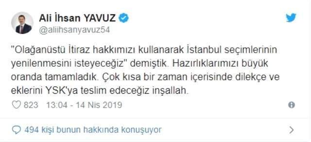 Olağanüstü itiraz hakkını kullanarak İstanbul seçimlerinin yenilenmesini isteyeceklerini belirten Yavuz, Hazırlıklarımızı büyük oranda tamamladık. Çok kısa bir zamanda dilekçe ve eklerini YSKya teslim edeceğiz ifadelerini kullandı."OLAĞANÜSTÜ İTİRAZ" SÜRECİAK Parti Genel Başkan Yardımcısı Ali İhsan Yavuz, Twitterdan yaptığı paylaşımında, AK Partinin İstanbuldaki yerel seçimlerin yenilenmesine yönelik "olağanüstü itiraz" sürecine ilişkin değerlendirmede bulundu. "HAZIRLIKLARIMIZI BÜYÜK ORANDA TAMAMLADIK""Olağanüstü itiraz hakkımızı kullanarak İstanbul seçimlerinin yenilenmesini isteyeceğiz" dediklerini anımsatan Yavuz, "Hazırlıklarımızı büyük oranda tamamladık. Çok kısa bir zaman içerisinde dilekçe ve eklerini YSKya teslim edeceğiz" ifadesini kullandı.İşte Ali İhsan Yavuzun paylaşımı;
