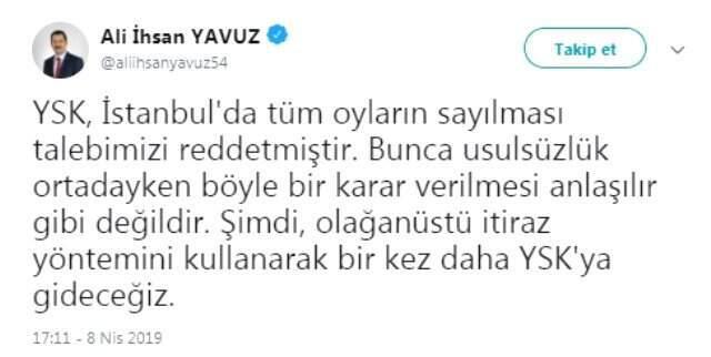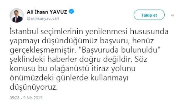 AK Parti Genel Başkan Yardımcısı Ali İhsan Yavuz, AK Partinin İstanbulda seçimlerin yenilenmesi için YSKya "tam kanunsuzluk" itirazı başvurusu yaptığı iddialarını "İstanbul seçimlerinin yenilenmesi hususunda yapmayı düşündüğümüz başvuru henüz gerçekleşmemiştir." diyerek yalanladı.