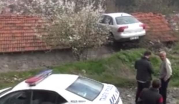 Park halindeki otomobilin, el freninin çekilmeden bırakılmasıyla çatıya uçtuğu üzerinde duruluyor.