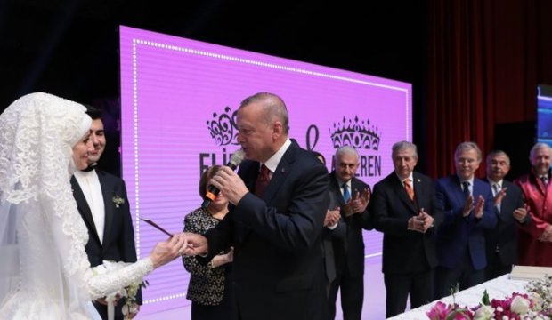 Alperen Bozdağ ve Elif Büşra Şuşoğlunun ATO Congresiumda düzenlenen nikah törenine, Cumhurbaşkanı Erdoğan, eşi Emine Erdoğanla geldi.