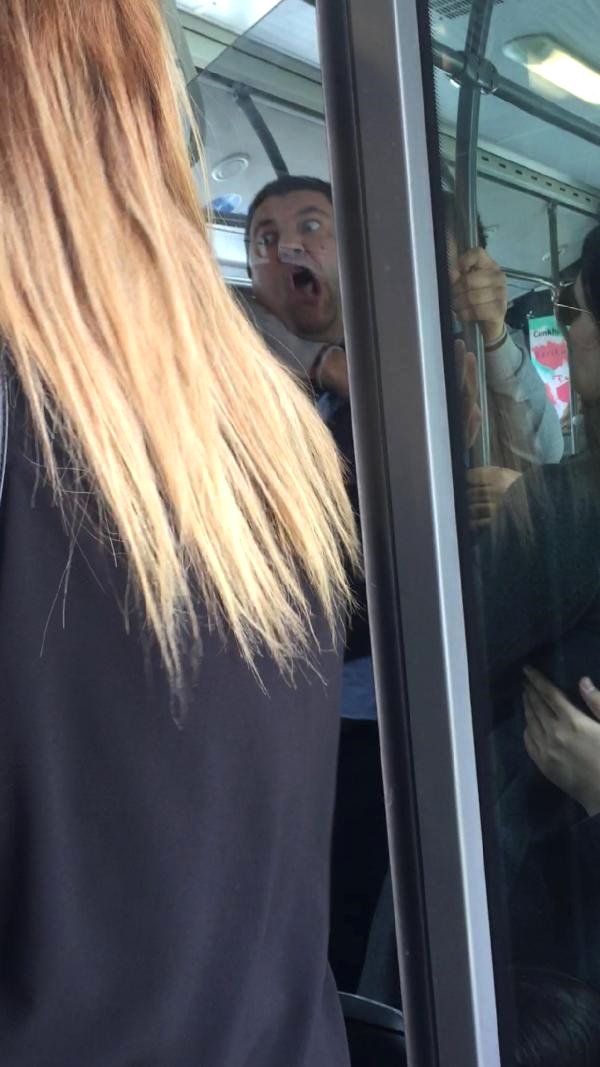 Görüntülerde, şoförün kendisini uyaran yolcuyu "Seni öldürürüm" diyerek tehdit etmesi ile yolcunun üzerine yürümesi ve diğer yolcular tarafından sakinleştirilmeye çalışıldığı anlar görülüyor.