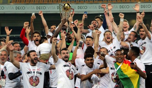 Süper Lig’e yücelme sonrası Gazişehirli futbolcular şampiyonluğu taraftarıyla kutlarken, Gazişehir Gaziantep Futbol Kulübü Başkanı Adil Sani Konukoğlu’nu futbolcular omuzlarda taşıdı.