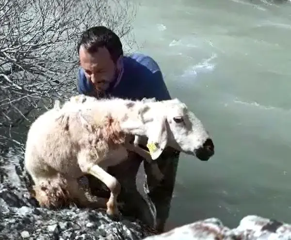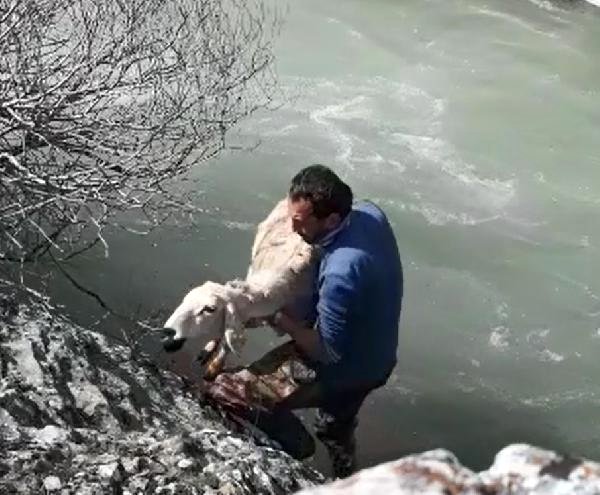 Kahramanmaraşın Afşin ilçesindeki Hurman Çayında mahsur kalan koyun, suya giren öğretmen Ali Kürtül tarafından kurtarıldı.