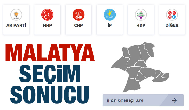 24 Haziran seçim sonuçlarına göre Malatyada AK PARTİ % 53.87 MHP % 16.12 CHP % 16.73 İYİ PARTİ % 4.27 HDP %7.02