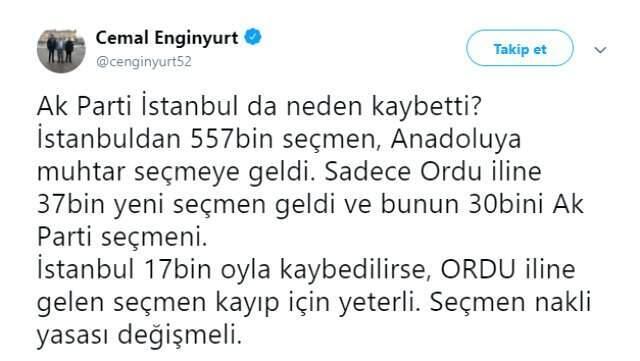 MHP Ordu Milletvekili Cemal Enginyurt"SEÇMEN NAKLİ YASASI DEĞİŞMELİ" "AK Parti İstanbulda neden kaybetti?" sorusuna yanıt veren Enginyurt, şunları kaydetti:" İstanbuldan 557 bin seçmen, Anadoluya muhtar seçmeye geldi. Sadece Ordu iline 37 bin yeni seçmen geldi ve bunun 30 bini AK Parti seçmeni. İstanbul 17 bin oyla kaybedilirse, Ordu iline gelen seçmen kayıp için yeterli. Seçmen nakli yasası değişmeli."İşte o tweet;