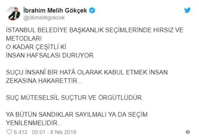 "İNSAN ZEKASINA HAKARETTİR"Gökçek, Twitterdan yaptığı paylaşımda şu ifadeleri kullandı: "İstanbul Belediye Başkanlık seçimlerinde hırsız ve metodları o kadar çeşitli ki insan hafsalası duruyor. Suçu insani bir hata olarak kabul etmek insan zekasına hakarettir. Suç müteselsil suçtur ve örgütlüdür. Ya bütün sandıklar sayılmalı ya da seçim yenilenmelidir."İşte Gökçekin o paylaşımı;