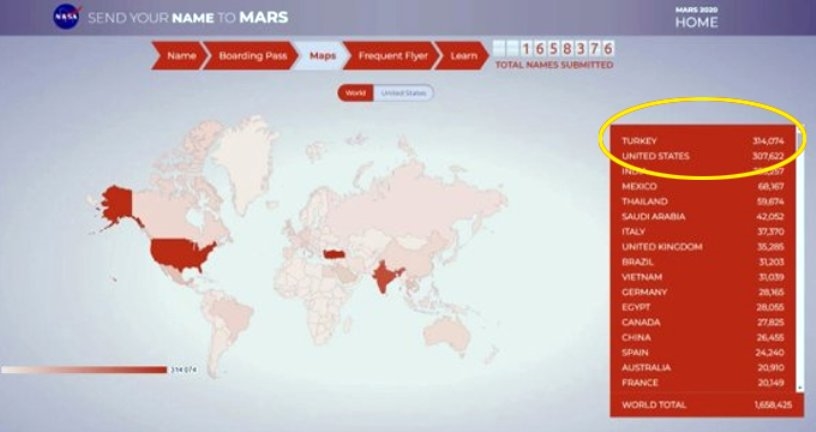 NASA, 2020 senesinde Güneş sistemindeki en DOĞRU komşumuz bulunan Marsa dünkü ortak Rover gök ara bulucu gönderecek. Uzay meraklılarını bu amacın içerisine adları ile müdahale geçirmek talip NASA, Send Your Name to Mars (İsmini Marsa Gönder) angın ortak kampanya başlattı. Türkiyeden 308 bin 454 insan adını Marsa havale yapmak düşüncesince NASAya başvurdu.