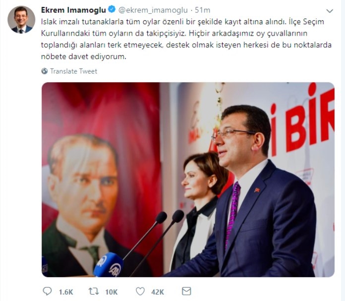 Basın açıklamasının ardından sosyal medyadan seçmenlerine çağrı yapan İmamoğlu, "Islak imzalı tutanaklarla tüm oylar özenli bir şekilde kayıt altına alındı. İlçe Seçim Kurullarındaki tüm oyların da takipçisiyiz. Hiçbir arkadaşımız oy çuvallarının toplandığı alanları terk etmeyecek, destek olmak isteyen herkesi de bu noktalarda nöbete davet ediyorum."