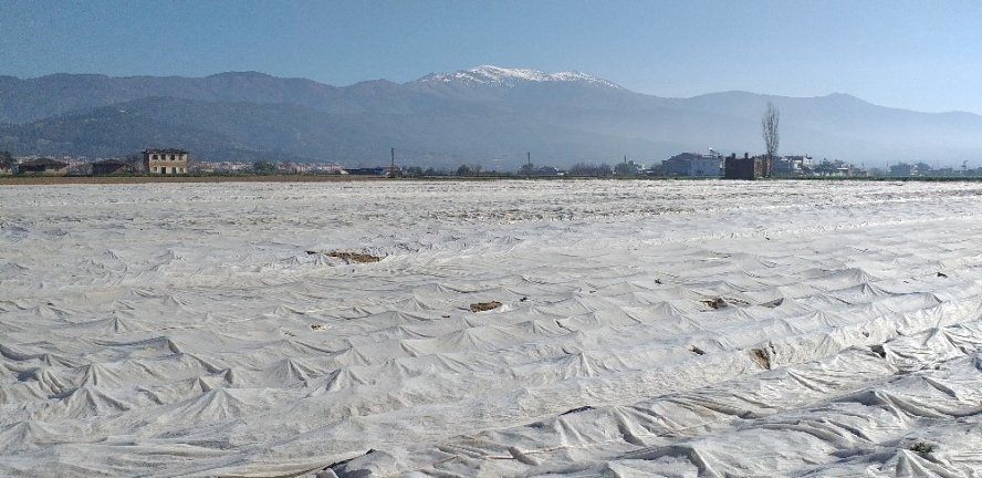 İzmirin Ödemiş ilçesindeki patates üreticileri, meteorolojinin zirai don uyarısına karşı tarım alanlarını elyaf örtüyle kapladı. Elyaflarla tarlalar, adeta kar yağmışcasına beyaza büründü.