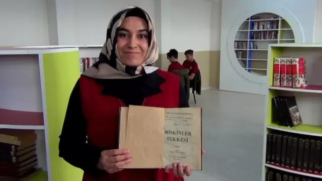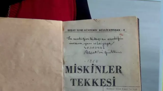 "EN SEVDİĞİM KİTAP EN SEVDİĞİM İNSANA HEDİYE" Erzincanda Mesleki ve Teknik Anadolu Lisesi tarafından oluşturulan kütüphane için depoda bulunan kitapların tasnifi sırasında roman, öykü ve oyun yazarı olan Reşat Nuri Güntekinin, eşi Hadiye Güntekin için imzaladığı Miskinler Tekkesi isimli kitaba rastlanıldı. 30 Ekim 1946 yılında Reşat Nuri Güntekin tarafından eşi için imzalanan kitapta En sevdiğim kitap en sevdiğim insana, yani Hadiyeye diye de kendisi tarafından bir not düşülmüş.OKUL MÜDÜRÜ KORUMA ALTINA ALDI73 yıl önce Reşat Nuri Güntekinin eşi Hadiye Güntekin için imzaladığı kitabı Miskinler Tekkesi isimli kitabı tasnif sırasında bulan Erzincanda Mesleki ve Teknik Anadolu Lisesi öğrencileri ise merak ettikleri Reşat Nuri Güntekinin kitaplarını okumaya başlarken, Okul Müdürü Gökmen Güler ise kitabı koruma altına aldı. İşte herkesin ilgisini çeken o kitap; ![]()
