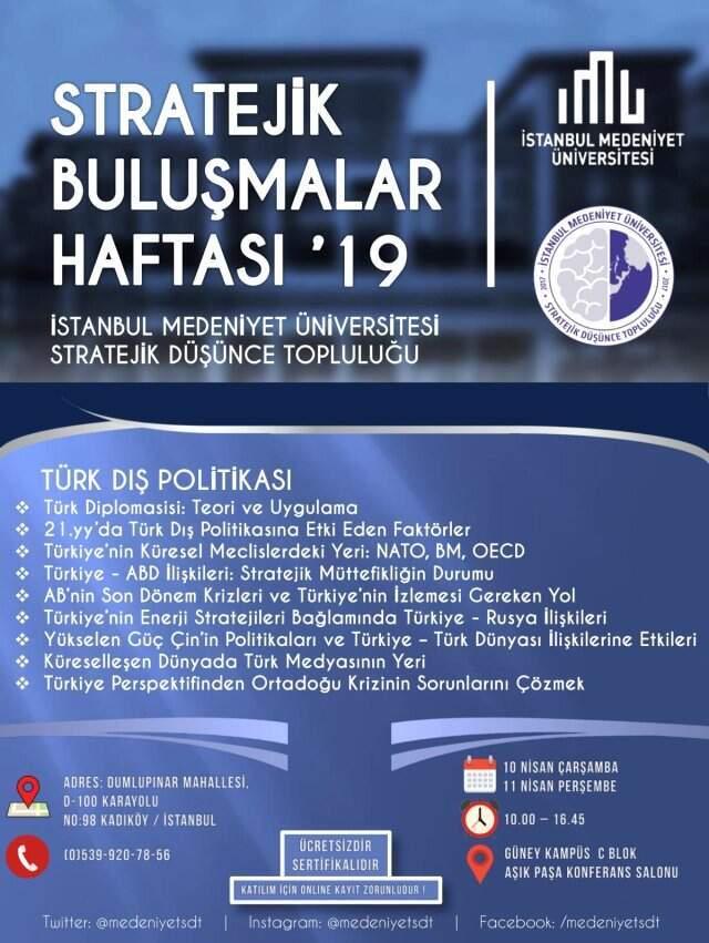 İstanbulun en gözde üniversite öğrenci kulüplerinden bir tanesi olan İstanbul Medeniyet Üniversitesi Stratejik Düşünce Topluluğunun düzenleyeceği "Türk Dış Politikası" konulu Stratejik Buluşmalar Haftası adlı 2 gün,10 oturumdan oluşacak etkinlik 10-11 Nisan tarihlerinde 09.30-17.00 saatleri arasında İstanbul Medeniyet Üniversitesi Göztepe Güney Kampüsü Aşık Paşa Konferans Salonunda gerçekleşecek. Etkinlik, yarın ( 10 Nisan) saat 09.30da başlıyor.