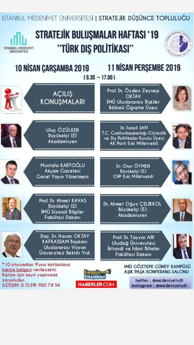 KATILIM ÜCRETSİZ10-11 Nisandaki "Türk Dış Politikası" konulu Stratejik Buluşmalar Haftası19 programı herkese ücretsiz.Kayıt yaptırmak için iletişim bilgileri: Cep tel: 05399207856E- Posta: [email protected] İnstagram: @medeniyetsdt Twitter: @medeniyetsdt4 BÜYÜKELÇİ, 4 AKADEMİSYEN, 1 GAZETECİ, 1 CUMHURBAŞKANI DANIŞMANI KONUŞMACI OLARAK KATILACAKKatılımcı listesi şu şekilde:10 Nisan Çarşamba09.30: Prof.Dr. Gülfettin ÇELİK (İstanbul Medeniyet Üniversitesi Rektörü)10.00: Doç.Dr. Aşkın Işıl SÖKMEN ALACA (İstanbul Arel Üniversitesi Uluslararası İlişkiler Bölümü Öğretim Üyesi) 11.15: Uluç ÖZÜLKER (Emekli Büyükelçi, Akademisyen) 13.15: Mustafa KARTOĞLU (Akşam Gazetesi Genel Yayın Yönetmeni) 14.30: Prof.Dr. Ahmet KAVAS (Büyükelçi (E), İstanbul Medeniyet Ünviersitesi Siyasal Bilgiler Fakültesi Dekanı)15.45: Doç.Dr. Hasan OKTAY (Uluslararası Vizyon Üniversitesi Rektör Yardımcısı, Kafkasya Stratejik Araştırmalar Merkezi Başkanı)11 Nisan Perşembe10.00: Prof.Dr. Özden Zeynep OKTAV (İstanbul Medeniyet Üniversitesi Uluslararası İlişkiler Bölümü Öğretim Üyesi)11.15: Dr. İsmail SAFİ (Cumhurbaşkanlığı Dış Politikalar ve Güvenlik Kurulu Üyesi, Ak Parti Eski Milletvekili, Akademisyen)13.15: Dr. Onur ÖYMEN (Emekli Büyükelçi, CHP Eski Milletvekili)14.30: Dr. Oğuz ÇELİKKOL (Emekli Büyükelçi, Akademisyen)15.45: Prof.Dr. Tayyar ARI (Uludağ Üniversitesi İktisadi ve İdari Bilimler Fakültesi Dekanı)