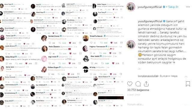 "GÜNLERCE ETMEDİĞİNİZ KÜFÜR VE TEHDİT KALMADI" DEMİŞTİBir devre martir ailelerinin beraberinde bulunduğu düşüncesince reaksiyon gördüğünü kail Yusuf Güney, İmamoğluna dayanak bulunan adlı sanlı adların paylaşımlarının bulunduğu fotoğrafı, "Bana tümüyle martir ailemizin beraberinde olduğum düşüncesince günlerce etmediğiniz taşlama kalay ve gözdağı kalmadı... Sanatçı etkisiz olmalıdır dediniz durdunuz ne şu demek oluyor ki bu tablodaki artist arkadaşlarımızı siz artist adına koymuyor musunuz hani rastgele müşterek reaksiyon falanca görmedim okumadım sanata az buçuk hürmet lütfen... Herkesin görüsüne saygım sonsuzdur ayni anlayışı hoşgörüyü de sizden bekliyorum saygılar" notuyla paylaşmıştı.