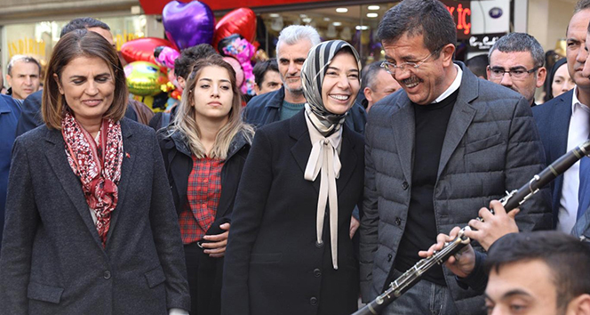 Nihat Zeybekci, eşi Ayşen Zeybekci ve AK Parti Konak Belediye Başkan adayı Melek Eroğlu, “İzmirin Kavakları” adlı şarkıyı hep birlikte söyledi. Çevrede toplanan İzmirliler ise Zeybekciyi alkışladı.